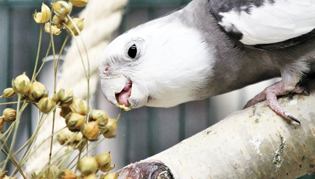 Ruoan avulla lintua pystyy aktivoimaan helposti. Kuvassa neitokakadu tutkii ja syö pellavan siemenkotia. Kuva: Kiuru Koponen