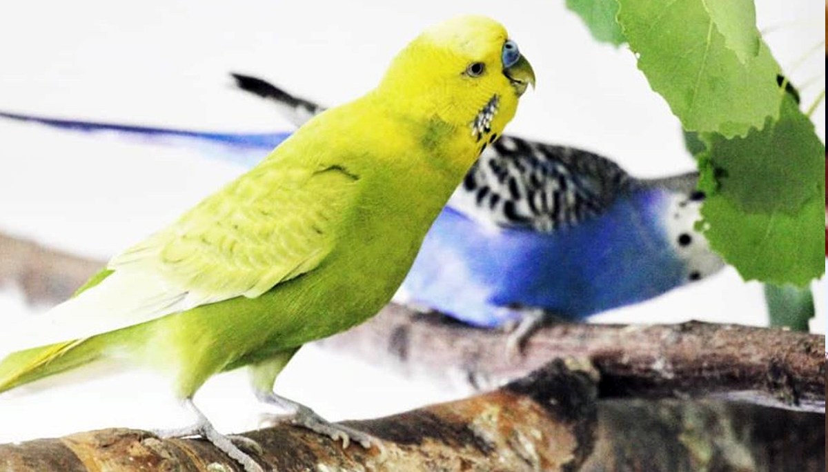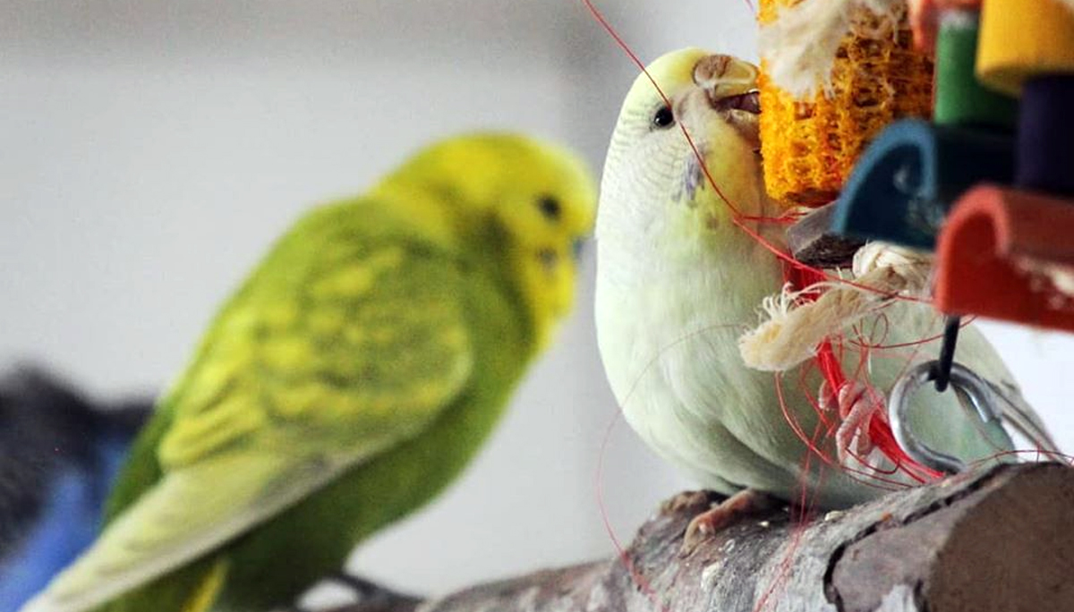 Undulaatti lajitoverin kanssa eläinkaupasta ostetun lelun kimpussa. Kuva: Kiuru Koponen